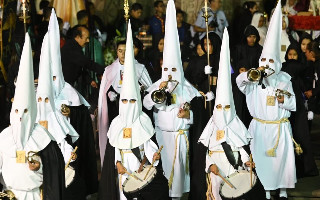Los integrantes de cada cofradía portan atuendos de los colores alusivos a la parroquia que representan y está conformada por nazarenos, cofrades (encapuchados), damas de rebozo, costaleros (quienes cargan imágenes religiosas), horquillaros (llevan los bastones de descanso) y para acompañar el silencio de luto también hay saeteras, pregoneros y bañaderos, quienes se posicionan en balcones de edificios emblemáticos del centro histórico.