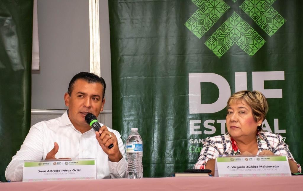 El titular de la Sedarh, José Alfredo Pérez Ortiz y la directora del DIF estatal, Virginia Zúñiga Maldonado, en representación de la presidenta del organismo asistencial, Ruth González Silva, firmaron el acuerdo para establecer dicho vivero en el Centro de Capacitación y Autoproducción de Alimentos del parque Tangamanga I, para producir especies vegetales para reforestar y alimentar.