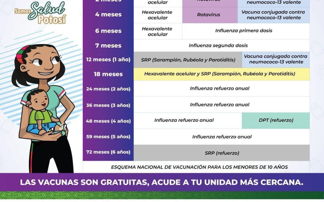 La titular de Vacunología dijo que en el Esquema Nacional de Vacunación para Niños y Niñas de 0 a 9 años se manejan en sector público las siguientes vacunas: para el recién nacido BCG y Hepatitis B; de 2 y 4 meses cumplidos la de Rotavirus; también a los 2,4 y 12 meses Neumococo conjugada; a los 2,4,6 y 18 meses la Hexavalente acelular; a partir de los 6 meses de edad la de Influenza (temporada invernal); la SRP se debe aplicar en 3 etapas, la primera dosis a los 12 meses de edad, la segunda, a los 6 años; niñas y niños que no cuentan con la primera dosis de vacuna SRP y cumplen 18 meses este 2023, deben ser llevados a vacunar y su segunda dosis deberá ser a los 6 años; a los cuatro años de edad hay que acudir a solicitar el biológico de la DPT (Difteria Tosferina y Tétanos).