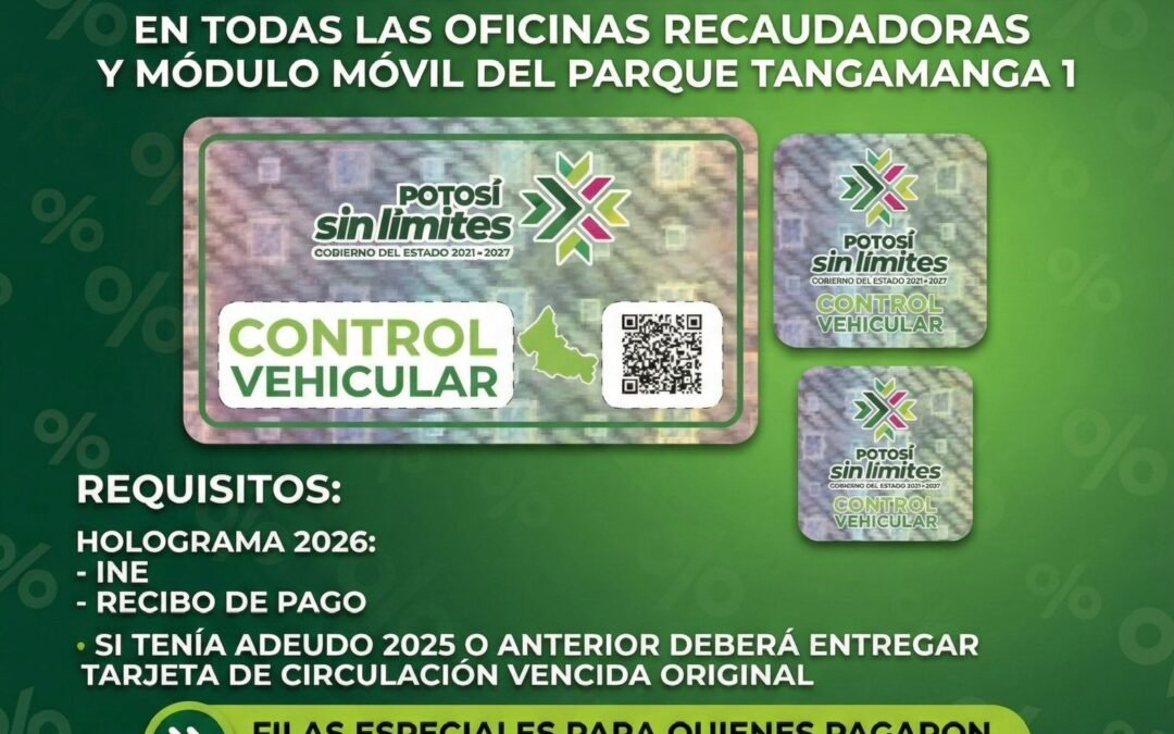 La Secretaría de Finanzas (Sefin) informó que el holograma de control vehicular 2026 ya se encuentra disponible en la totalidad de las oficinas recaudadoras, así como en el módulo móvil instalado en el parque Tangamanga I, lo que permite a las y los contribuyentes concluir su trámite de manera presencial.