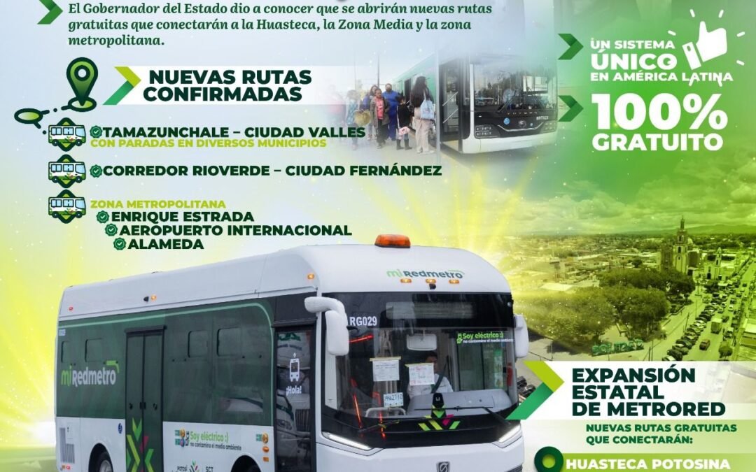 San Luis Potosí se consolidará con una movilidad sin límites, con las nuevas rutas del sistema gratuito MetroRed, dio a conocer el Gobernador de San Luis Potosí, Ricardo Gallardo Cardona, tras confirmar que durante el 2026 comenzarán a operar los recorridos de Tamazunchale a Ciudad Valles pasando por diferentes municipios, así como el corredor Rioverde–Ciudad Fernández y en la zona metropolitana desde Enrique Estrada, pasando por el Aeropuerto Internacional hasta la Alameda.